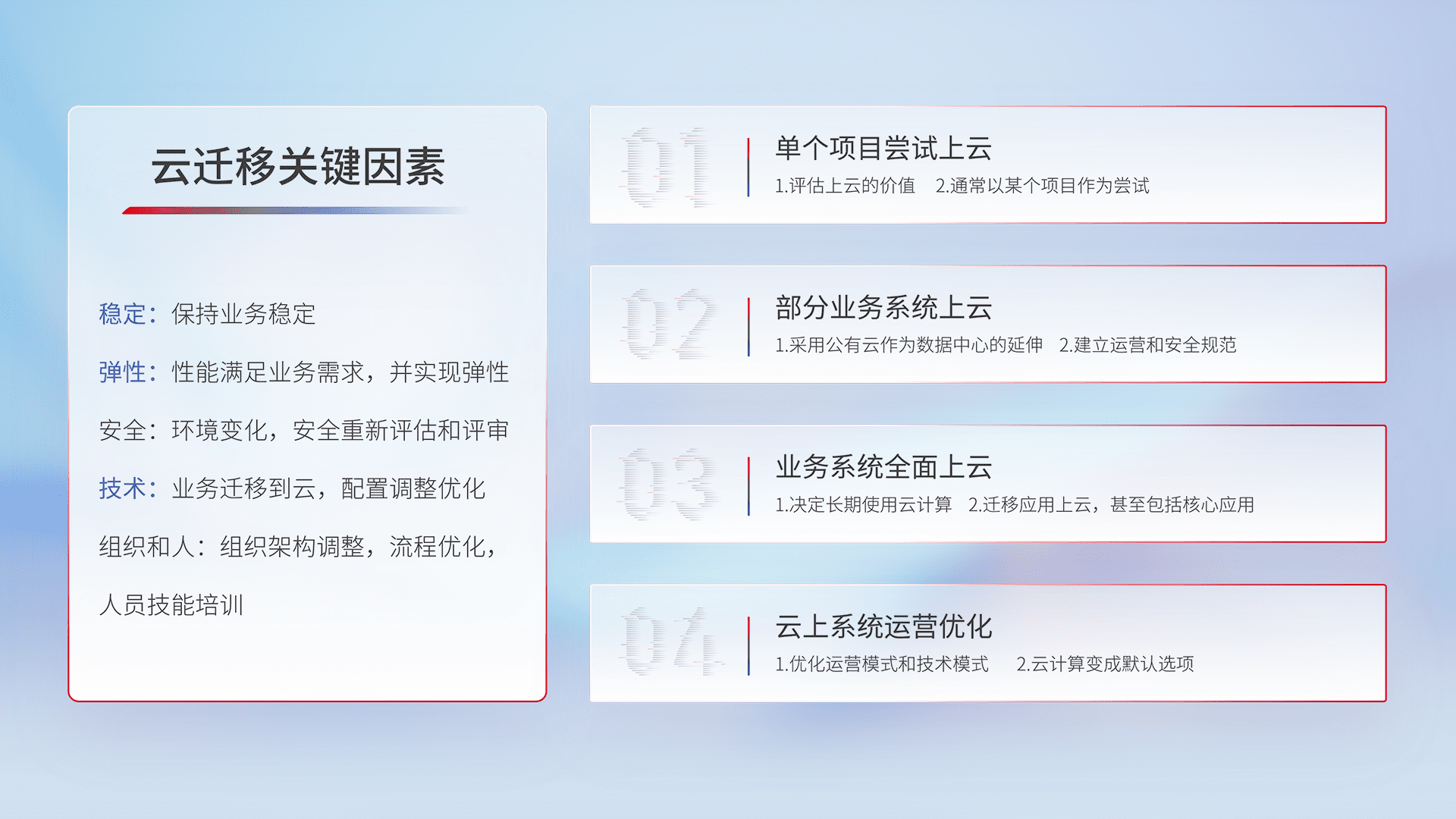 结合实际业务,,,,从规划设计、、云平台选型、、、、云原生改造、、、、数据迁移、、、、集成交付,,,迁移全过程为客户识别最佳上云路径,,,,做好风险识别管理,,,,设计网络架构、、、身份权限、、、安全审计合规、、操作审计、、日志审计、、、监控告警策略、、多站点容灾设计等,,对云上基础设施进行整体规划,,,,提升IT治理水平,,,,以满足弹性、、、、高可用、、高性能的需求。。