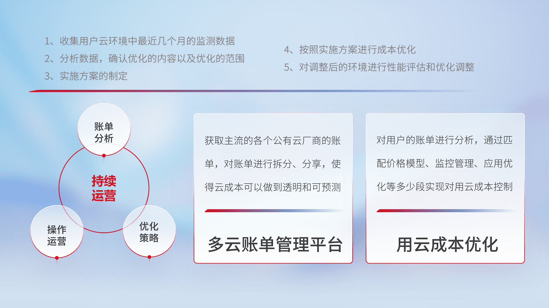 通过多云纳管,,以统一的资源数据模型把客户的云资源进行抽象和封装,,,,进而实现对多云资源的统一操作,,,,保障云资源管理的可靠性、、稳定性与可用性。。。量身定制化运维内容,,,配置、、、开发运维、、、、补丁管理、、、备份、、、监控、、认证和访问管理、、审计和日常巡检等,,保障在用云过程中的可靠度,,,稳定度以及高可用率。。。